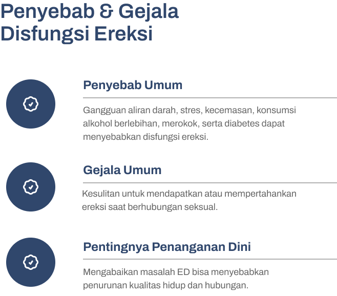 Disfungsi Ereksi (ED) dapat disebabkan oleh berbagai faktor, antara lain: